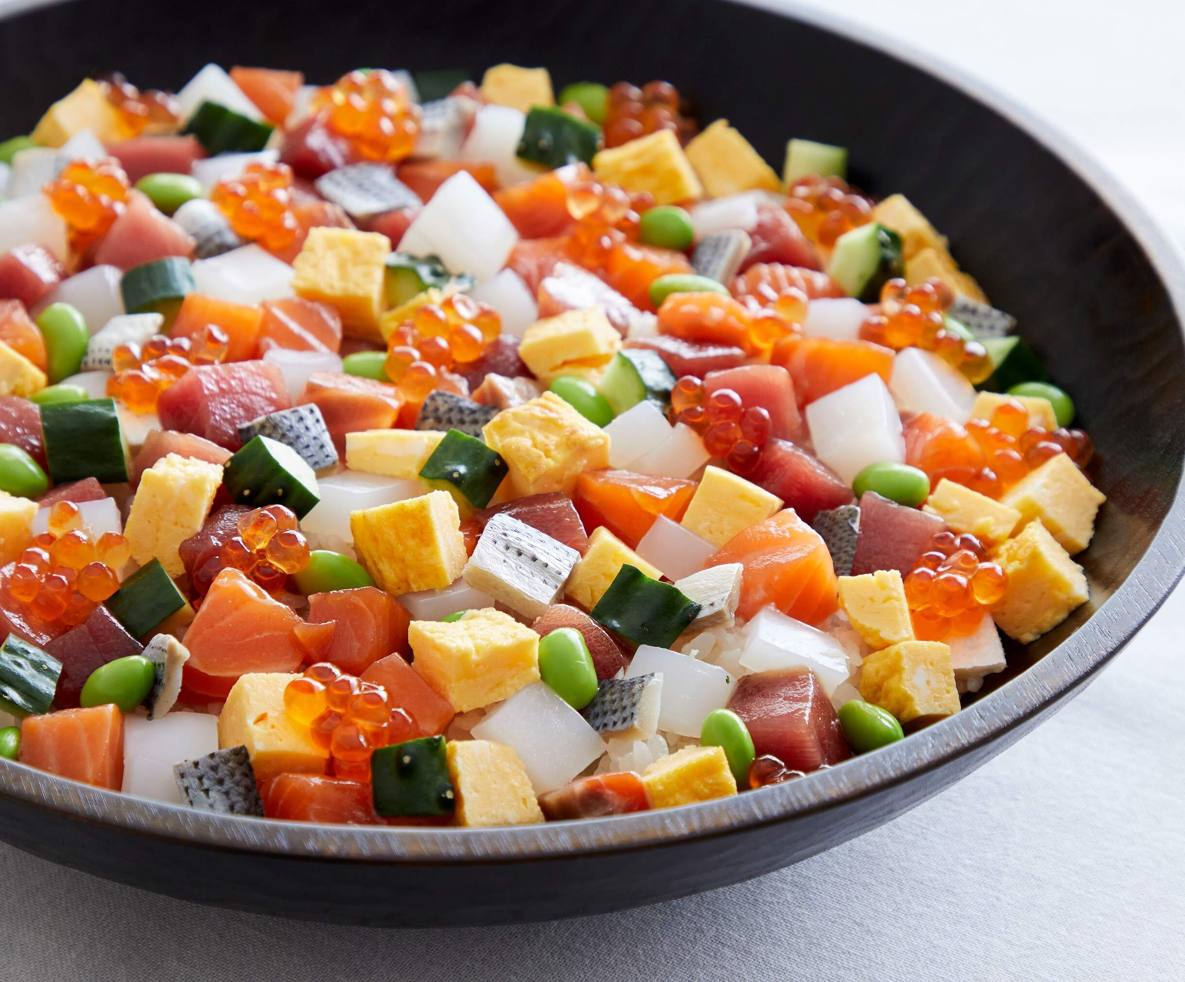 ひなまつりのお祝いにぴったりな彩り豊かなごはんとして、まずおすすめしたいのが「ばらちらし寿司」です。